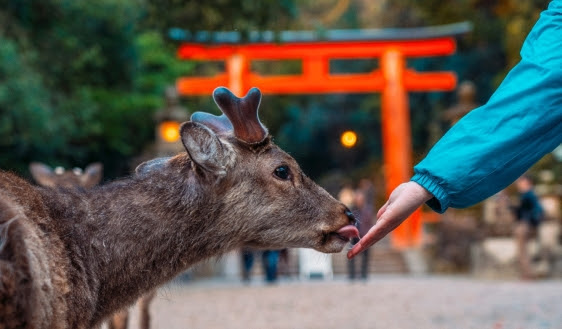Cette cohabitation n’est cependant pas celle d’un parc animalier : les cerfs traversent les rues, broutent les jardins privés ou les pelouses publiques et ils interagissent quotidiennement avec les habitants, fusionnant spiritualité shinto et urbanisme dans un modèle hybride sans autre équivalent aujourd’hui à travers le monde.