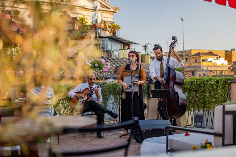 Le 9Hotel Cesàri se distingue par sa programmation culturelle. Plusieurs fois par semaine, la terrasse s’anime au rythme de sessions live : jazz, soul, pop acoustique ou DJ sets. Ces moments musicaux, pensés pour être intimistes, subliment l’expérience et créent une atmosphère vibrante que les Romains eux-mêmes adorent fréquenter.